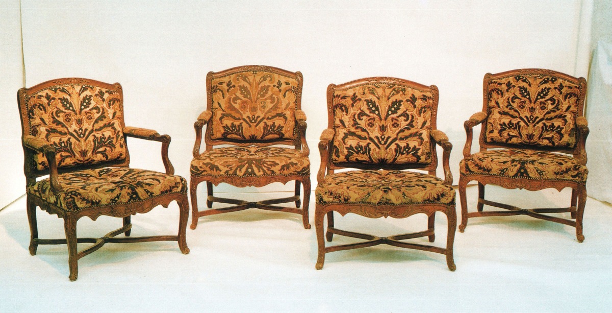 Garniture en tapisserie aux gros points à feuillage vert sur fond crème. Ces sièges de par leur qualité peuvent être attribués à CRESSON.