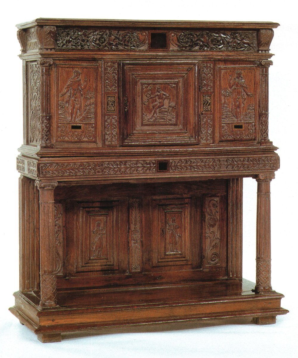 CABINET en bois naturel mouluré et sculpté, monté sur support à colonnes et pilastre. Dans la partie supérieure, il ouvre à un battant encadrant de panneaux ornés de déesses mythologiques, terminé par des colonnes engagées. Base et frise à rinceaux, feuillages, amours, pennes et motifs dits: « en cuir découpé ».