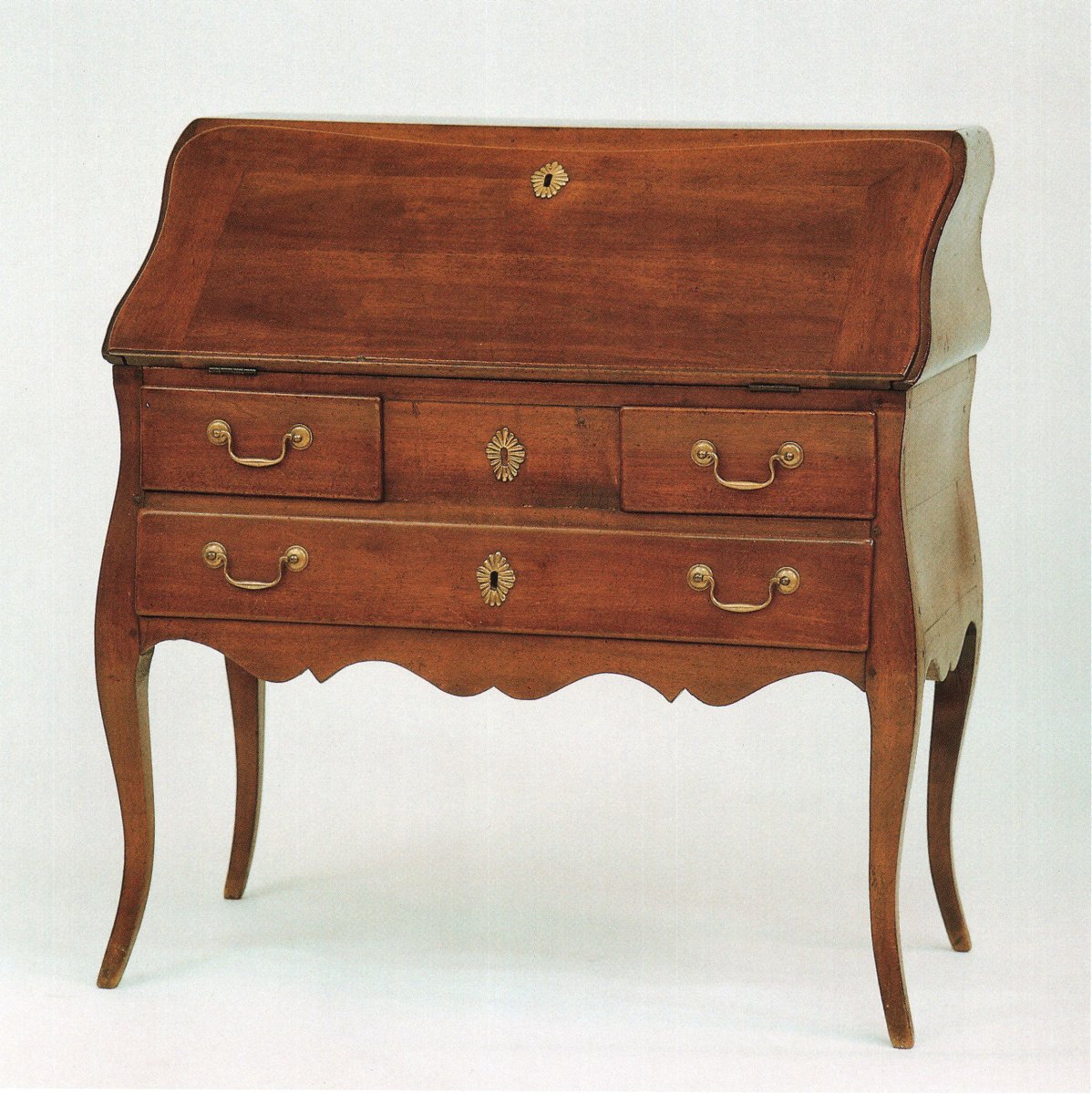 BUREAU DE PENTE en bois naturel, de forme galbée; l'abattant dissimule quatre tiroirs, des casiers et une tirette. Trois tiroirs dans la ceinture. Pieds cambrés.