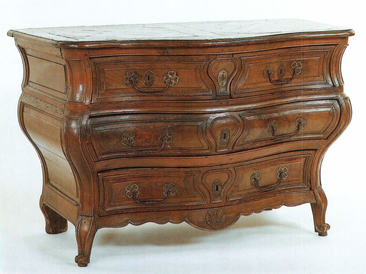 COMMODE galbée à trois rangs de tiroirs, le premier en deux parties. Elle est en noyer mouluré, montants très galbés, petits pieds à volutes.