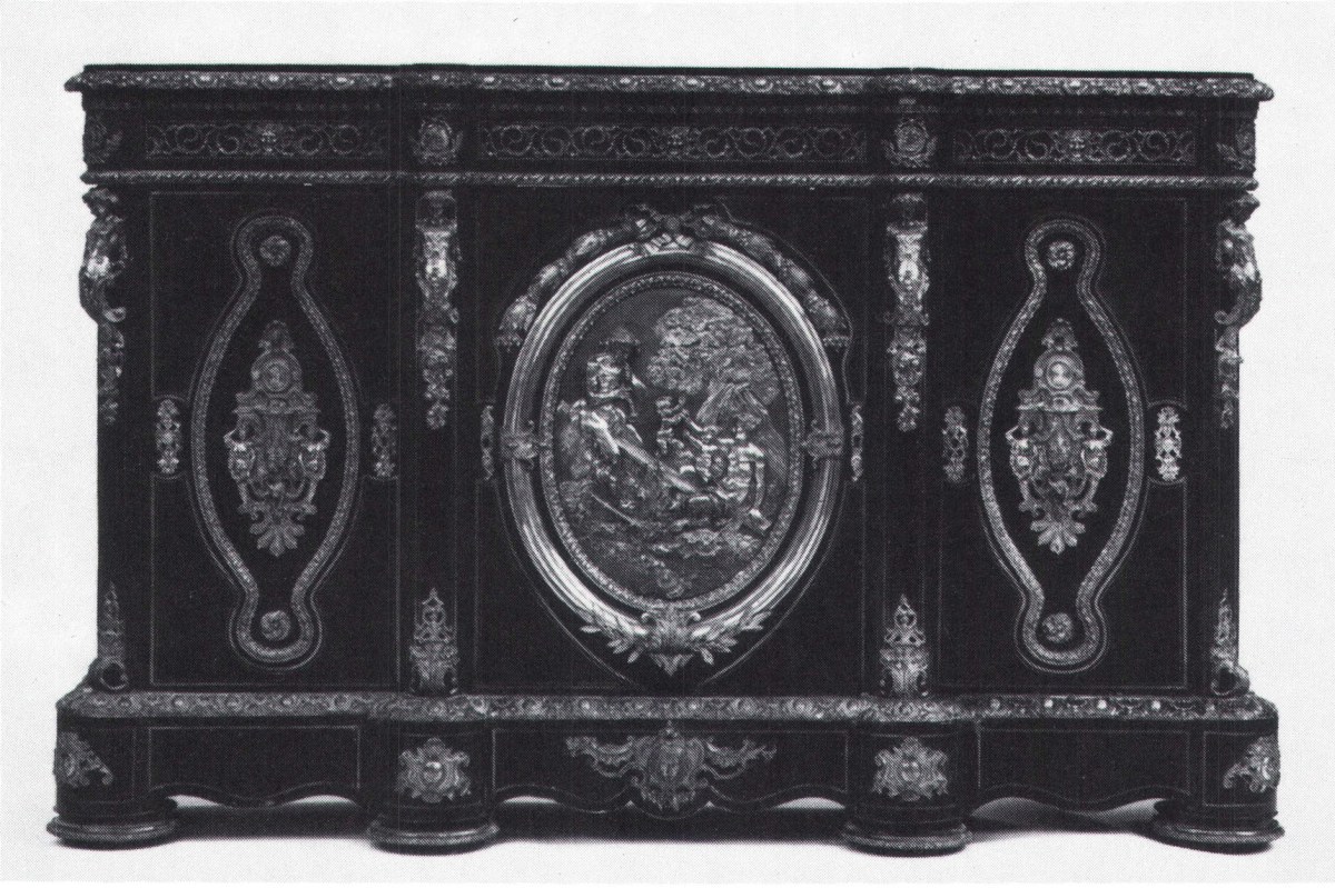 Il est orné d'espagnolettes, médaillon central dans le goût de Clodion: La famille du faune.