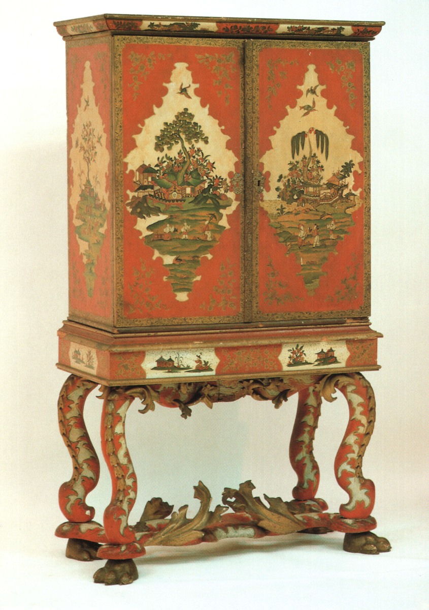 Il est en laque européen dans le goût chinois polychrome et or sur fond rouge et contre-fond crème. Il offre des paysages avec personnages, pagodes, animaux, fleurs et feuillages dans des encadrements dorés à rinceaux fleuris. L'intérieur est également décoré dans le même esprit mais sur fond coquille d'œuf.