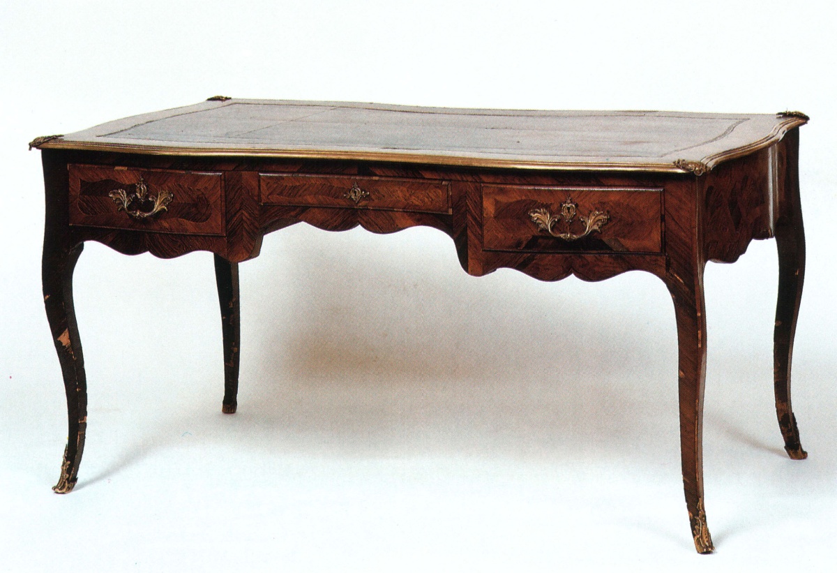 Beau et rare BUREAU plat de milieu mouvementé en placage de bois de rose, de violette et palissandre dans des encadrements à filets; il ouvre par trois tiroirs sur chacune des grandes faces et repose sur des pieds cambrés. Estampille de MIGEON.