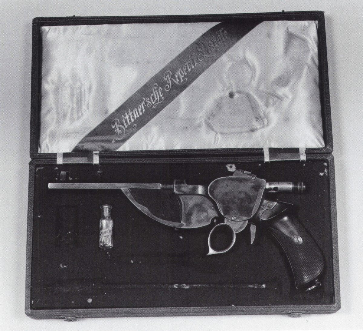 PISTOLET BITINER modèle 1890, calibre 7,7 mm, marqué sur la carcasse « PATENT BITINER », plaquettes de crosse en bois, en partie quadrillé. Finition bleuie, jaspée. Très bon état, proche du neuf, n° 89.97. Dans son coffret en bois recouvert de cuir noir, garni de velours vert et soie blanche, avec bande en diagonale verte marquée « BITINER SCHE REPETIR PISTOLE ».