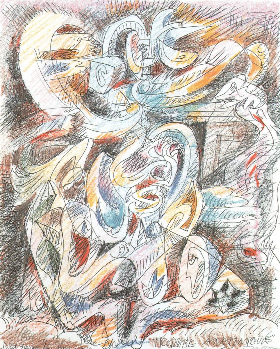 André MASSON (1896-1987). Labyrinthe initiatique (vers 1962). Dessin au crayon à bille et de couleurs, signé au crayon en bas à droite sur le dessin. Ce dessin est une étude pour une « petite gravure très fine et un tableau » (annotation de l'artiste en bas du dessin à gauche). Toutes les annotations, encre ou crayon, aussi bien sur le dessin que sur le papier sont de la main d'André Masson.