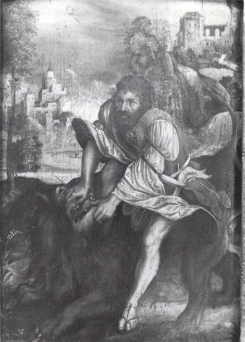 ECOLE ITALIENNE DE LA FIN DU XVIIème siècle. Marc maîtrisant un lion. Huile sur panneau.