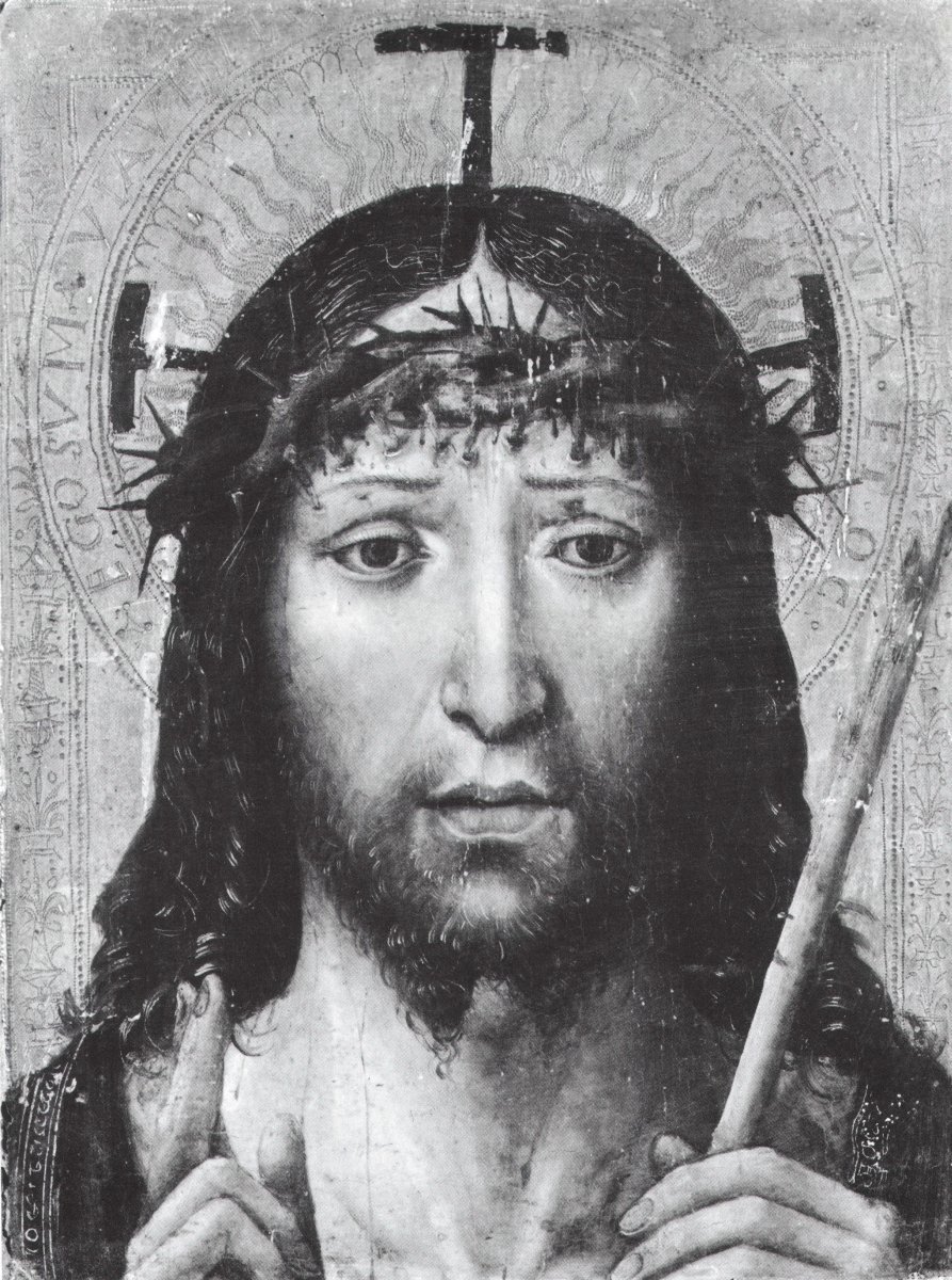 ICONOGRAPHIE: L'image résulte de l'association de deux thèmes iconographiques distincts utilisés dans des panneaux de dévotion: celui traditionnel du Salvador Mundi bénissant et celui de l'Ecce Homo (Saint Jean 19 ; 4¬6) dont la vogue apparaît à la fin du XVème siècle.