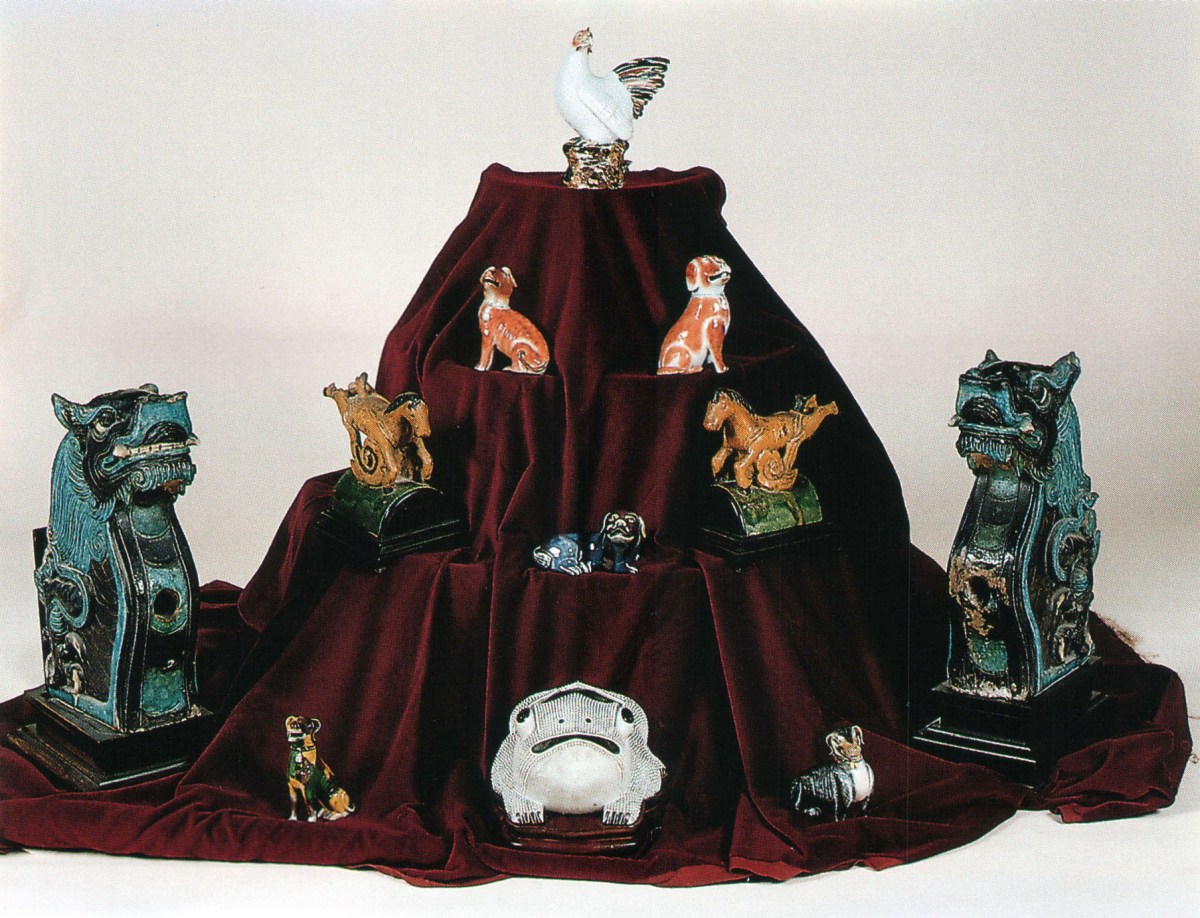 PAIRE D'ORNEMENTS DE FAITAGE, en grès recouvert d'un émail vert...