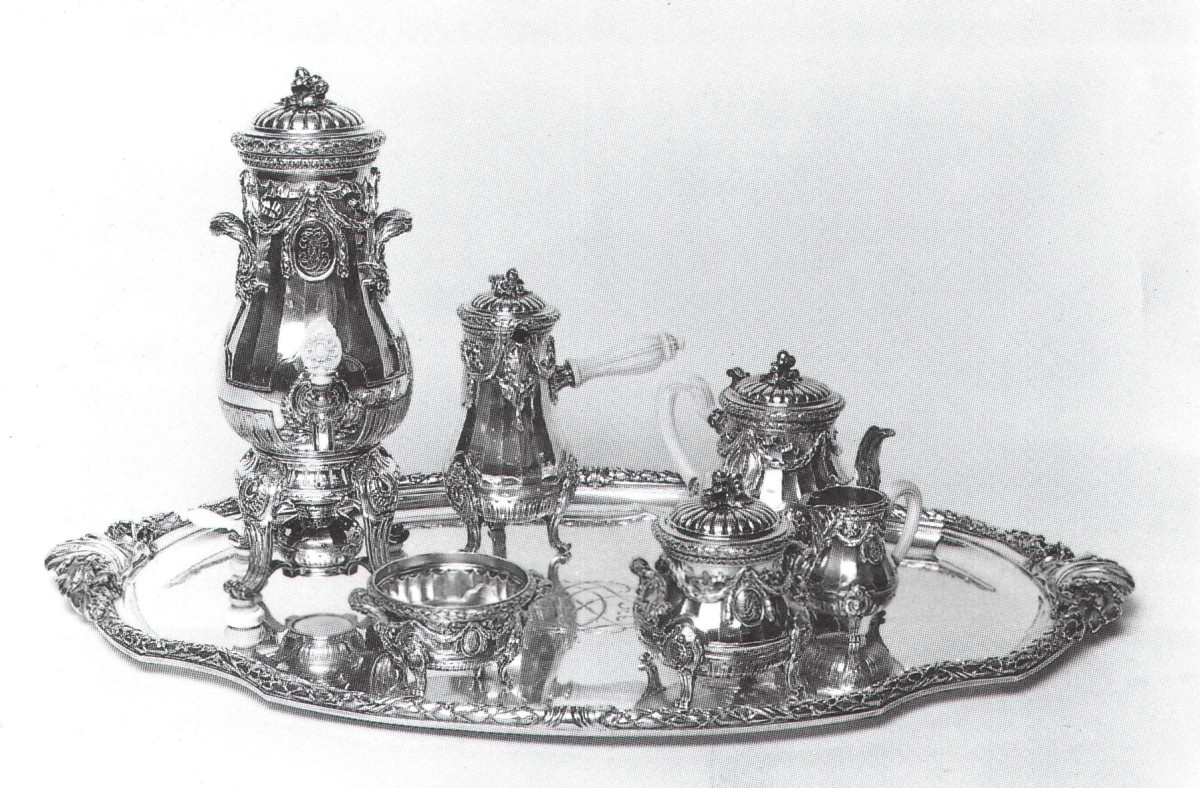Exceptionnel SERVICE A THE ET A CAFE en argent, au répertoire iconographique Louis XVI: godrons, fruits, tores de laurier, acanthes stylisées, festons, avec initiales entrelacés. Patins et boutons en ivoire. Il comprend: un plateau (86 x 55 cm), une fontaine à thé, une chocolatière, un pot à crème, une verseuse, un sucrier, un confiturier. Travail de la Maison Boin Taburet, orfèvre à Paris. Poinçon Minerve.