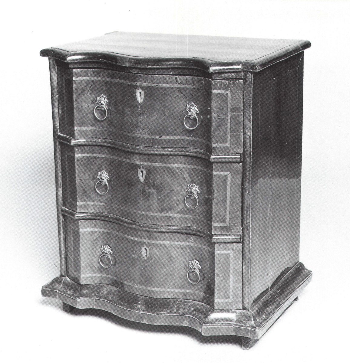 COMMODE en noyer et placage de noyer, façade en arbalète ouvrant à trois tiroirs. Poignées de tirage en bronze doré: anneaux et muffles de lion. Angleterre, XVIIIème siècle.