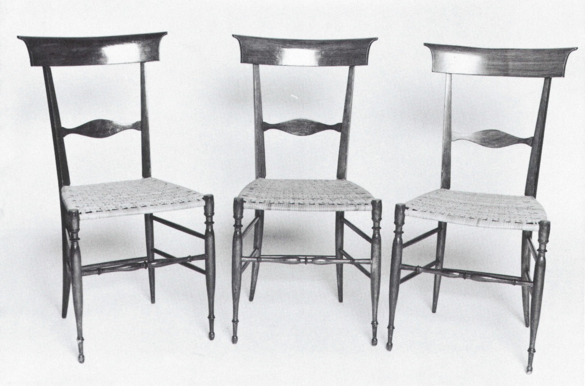 SUITE DE TROIS CHAISES en acajou, à dossier ajouré; Pieds antérieurs en fin fuseau, pieds postérieurs sabre, traverse imitation bambou. Assise cannée. Epoque Charles X.