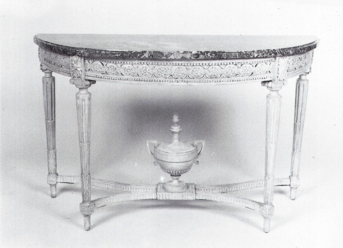 CONSOLE demi-lune en bois laqué blanc mouluré et sculpté d'une frise de fleurs ajourées en ceinture; pieds à cannelures rudentées et feuilles de lotus, réunis par une entretoise ornée en son centre d'un pot couvert. Dessus de marbre gris. Travail de qualité de style Louis XV, XIXème siècle.