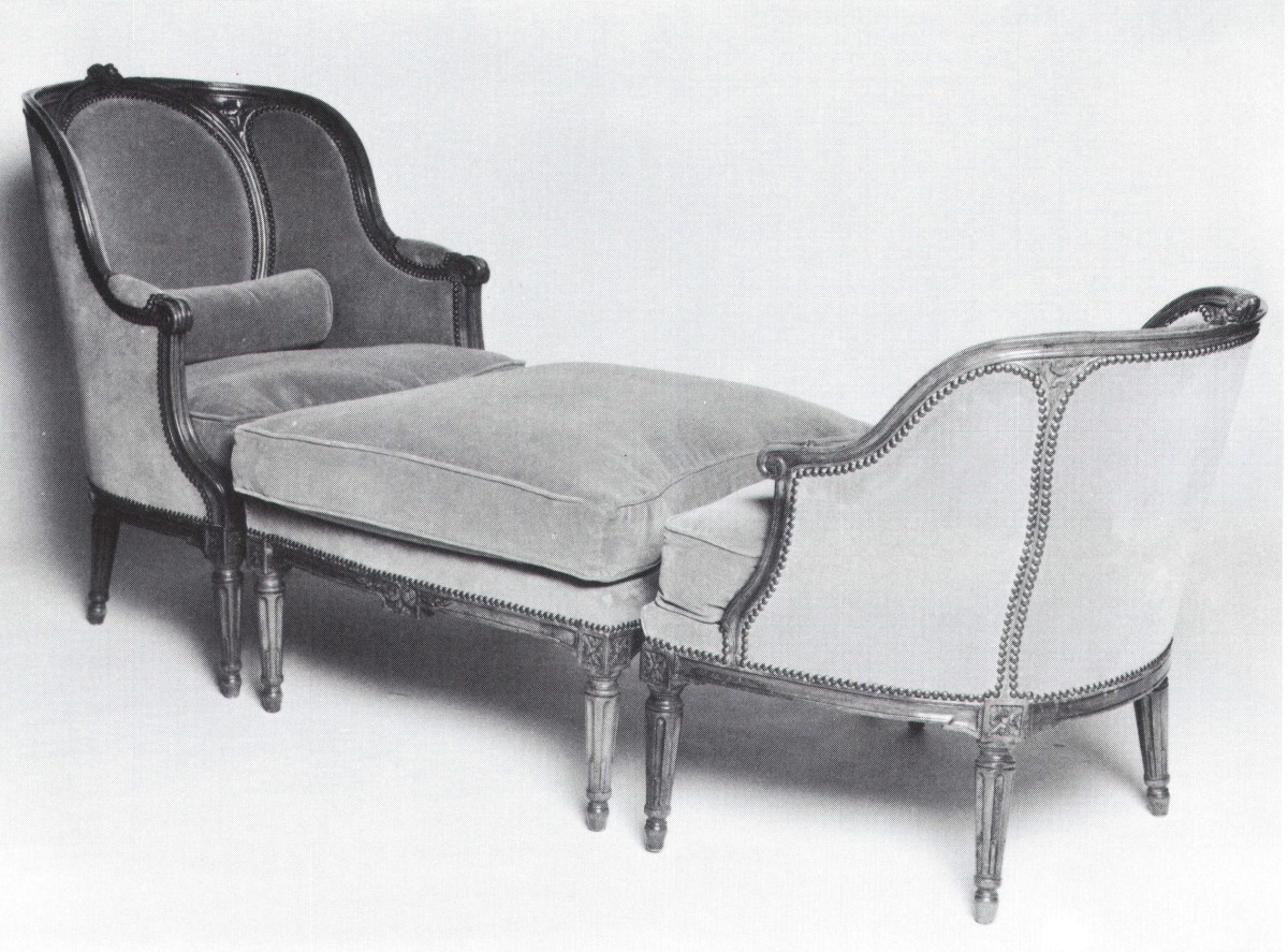 DUCHESSE BRISEE en bois naturel, mouluré et sculpté de fleurettes. Piétement à cannelures en pointes d'asperges. Dés de raccordement à quatre feuilles. Epoque Louis XVI.