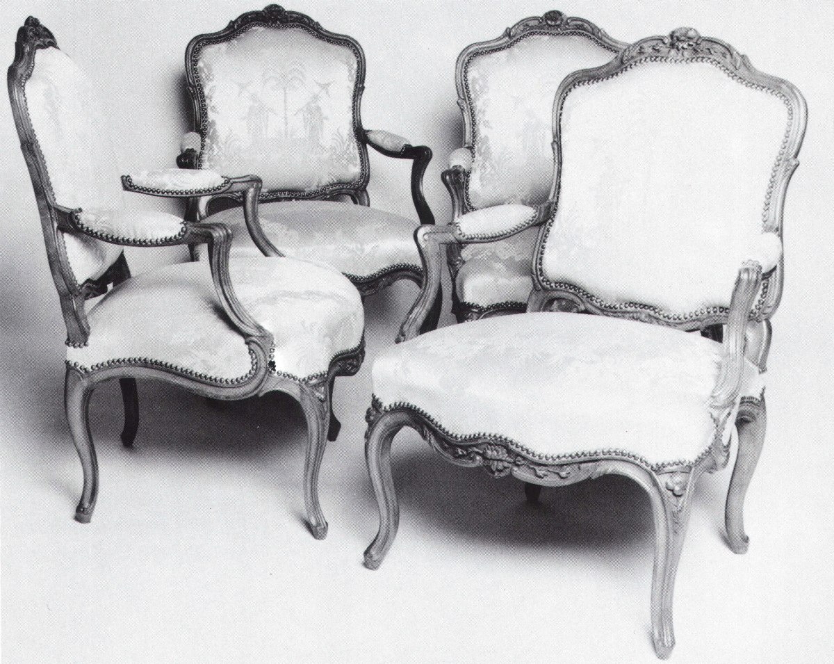 Exceptionnelle SUITE DE QUATRE FAUTEUILS à la Reine, en noyer richement sculpté de feuillages et de fleurs. Accotoirs en retrait en coup de fouet feuillagé, ceinture sinueuse, pieds cambrés nervurés. Estampille de F. CANOT accompagnée d'une fleur et d'un « S ». Epoque Louis XV. Recouverts d'une soierie au décor chinoisant d'après J-B PILLEMENT. François CANOT (mort le 29 octobre 1786), beau-frère du célèbre menuisier lyonnais Pierre NOGARET avec lequel il travailla.