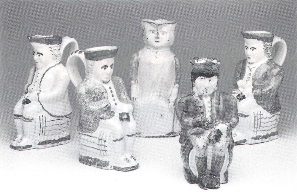 PICHET anthropomorphe dit POT JACQUELINE, en faïence polychrome, figurant une femme assise, les mains sur les genoux.
