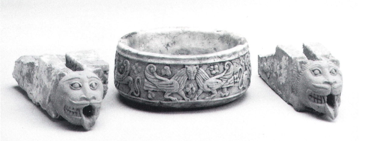 VASQUE BÉNITIER EN MARBRE DE VÉRONE. Décorée sur tout le pourtour de deux groupes en relief s'alternant. Le premier représente deux griffons couronnés vus de profil et se faisant face. Le second deux griffons vus de profil réunis en une tête léonine unique vue de face. Semi de motifs trilobés et quadrilobés sur tout l'ensemble. Italie du Nord. Style vénéto-byzantin.