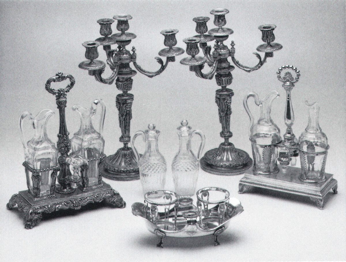 HUILIER-VINAIGRIER en argent repoussé: receptacles quadrangulaires, fût central feuillagé, et base rectangulaire reposant sur des patins. Décor feuillagé, d'acanthes et de coquilles. Flaconnage en cristal taillé (accident à un bouchon). Poinçon Minerve.