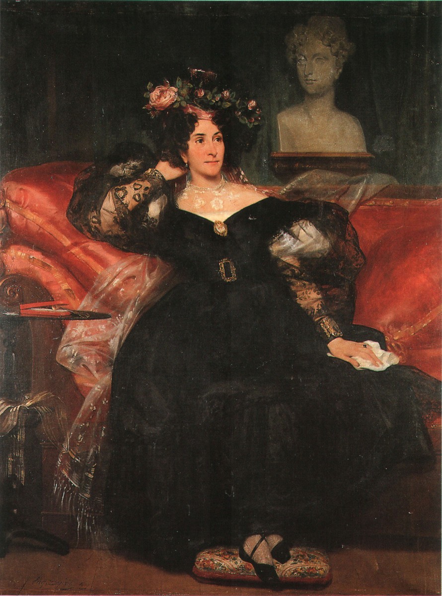 Eugène DEVERIA (Paris 1808 -Pau 1865). « Portrait de Mme Jules-Antoine DROZ ». Un buste de Droz figure à l'arrière-plan de notre tableau. Huile sur toile agrandie dans la partie supérieure. Signée et datée en bas à gauche: Eug. Deveria 1833.