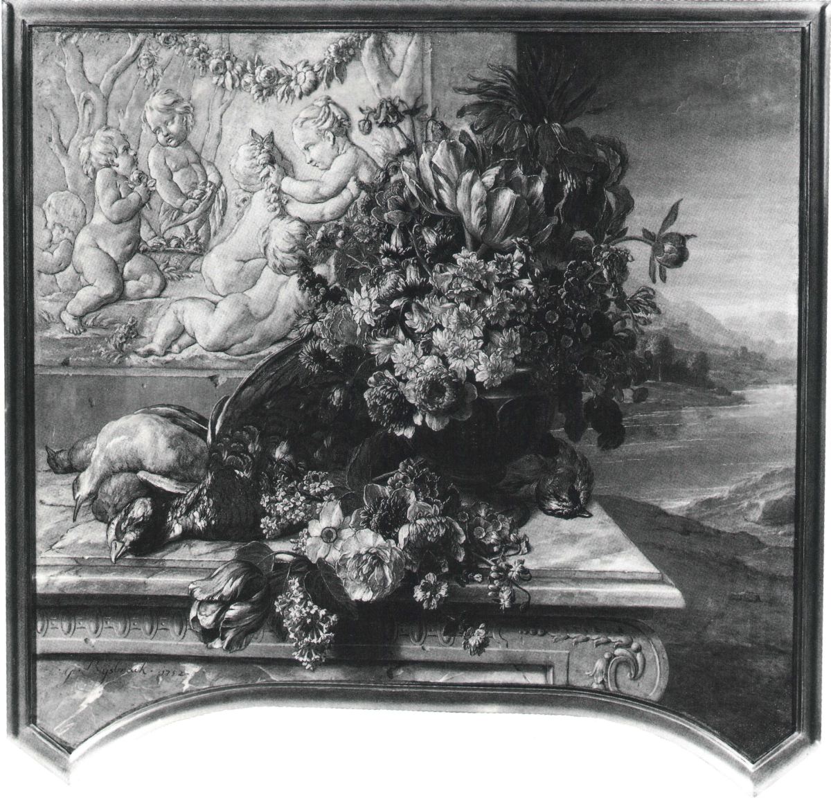 RYSBRACK Gérard (Anvers 1696-1773). Bouquet de fleurs et faisan sur un entablement devant un bas-relief. Toile de forme chantournée formant dessus de porte. Signée et datée en bas à gauche: G. Rysbrack 1752.