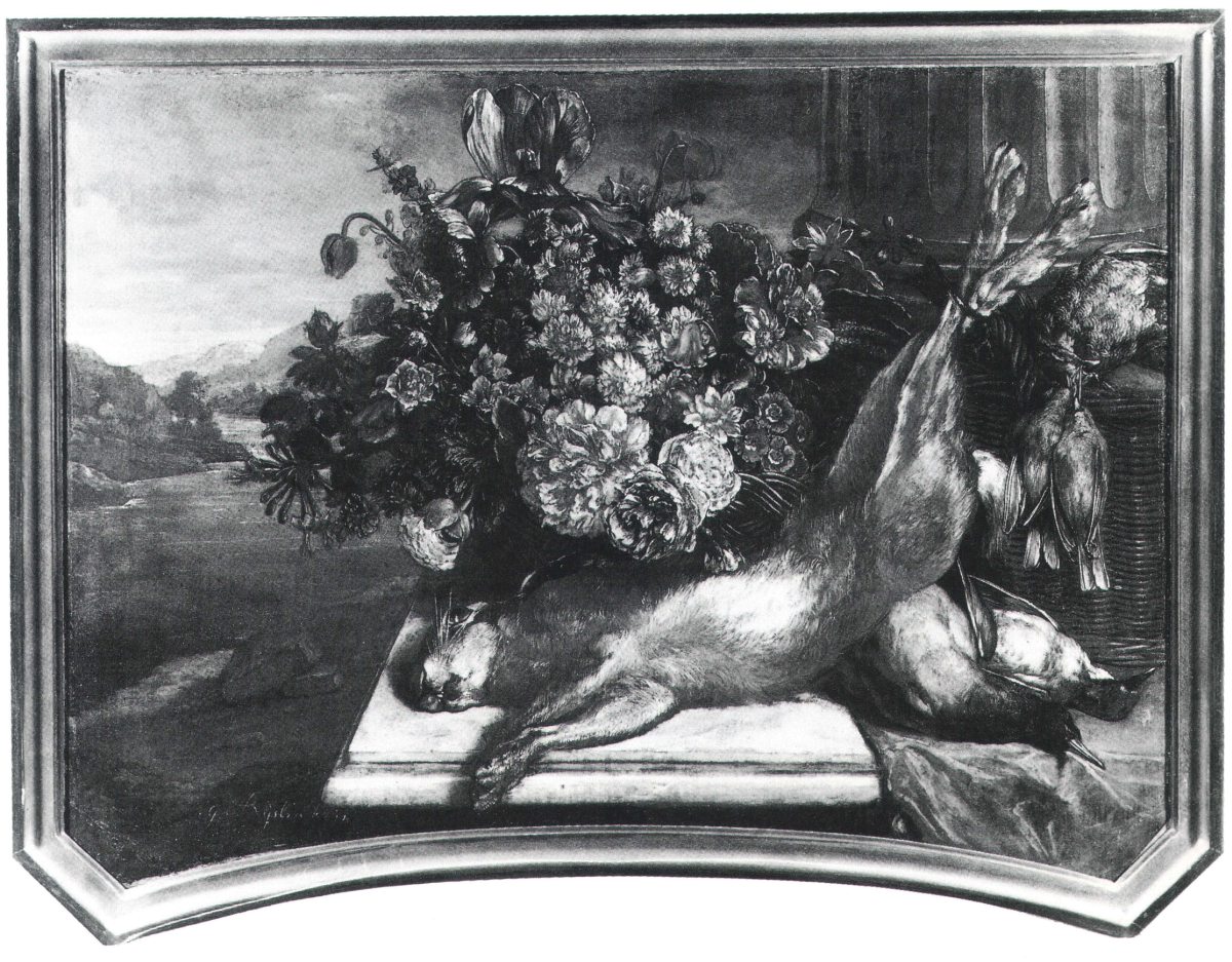RYSBRACK Gérard (Anvers 1696-1773). Bouquet de fleurs et lapin devant un paysage. Toile de forme chantournée formant dessus de porte. Signée et trace de date en bas à gauche: G. Rysbrack 17. (?). (Usures).