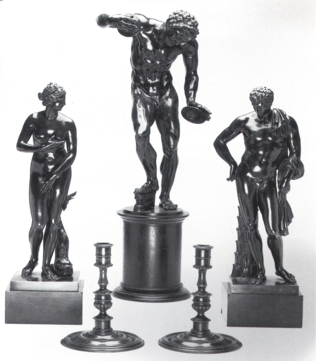 Paire de FLAMBEAUX, en bronze à patine brune, de forme balustre à large base, ornés de perles et godrons.