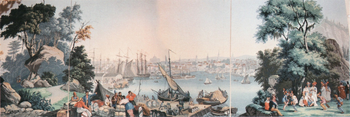 ― Vue complète et panoramique du port de Boston, encadrée par des frondaisons à gauche, et la danse indienne du calumet à droite.