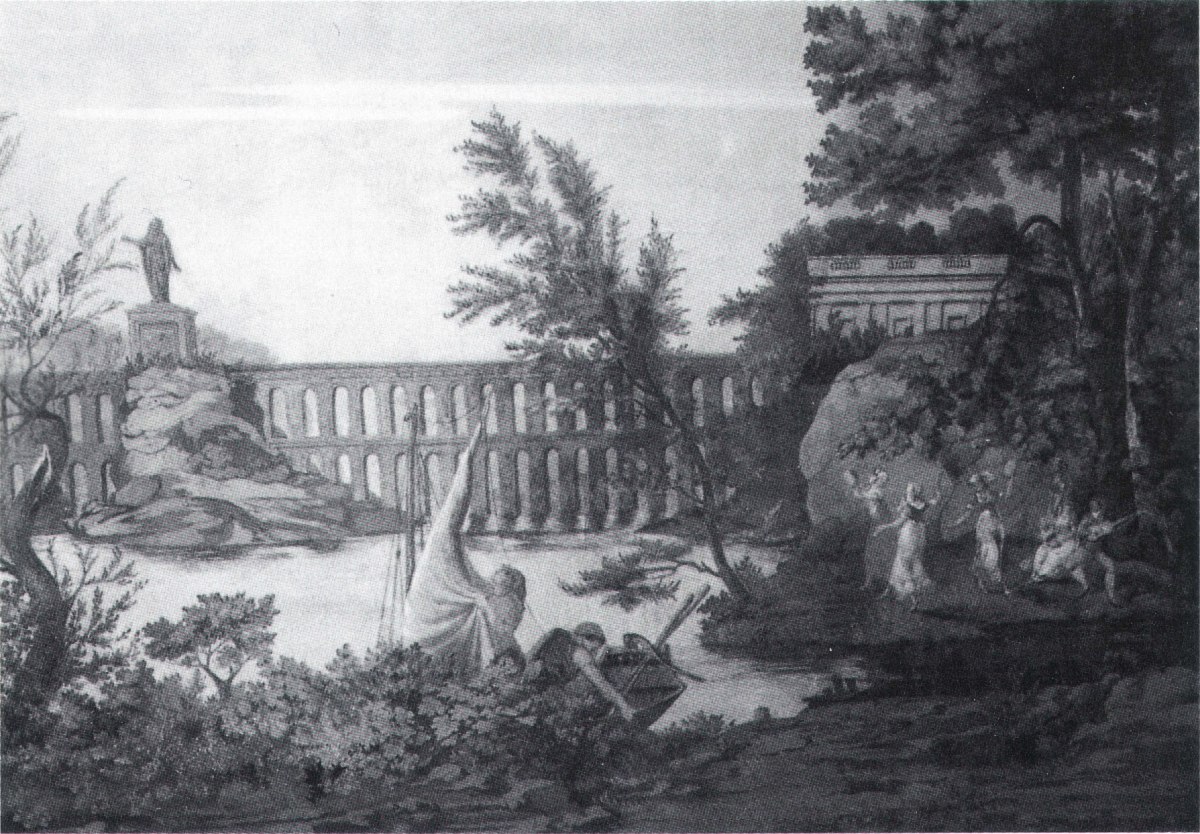 Sur fond de ruines, les personnages sont traités d'après Vernet sur un mode pittoresque: pêcheurs, danse.