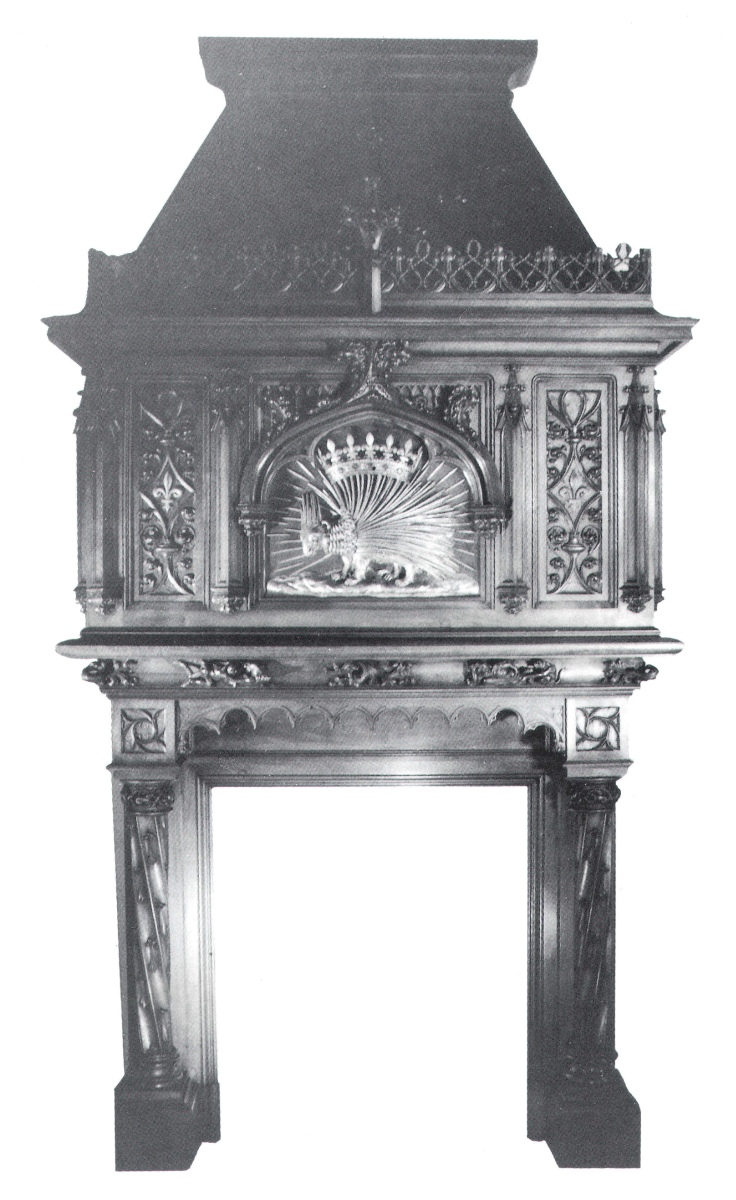 CHEMINÉE monumentale, en noyer, mouluré et sculpté, de style néo-gothique. Riche décoration: fleurs de lys, hermines, aristoloches, cordelettes, diables, cochons, chiens, escargots, lézards. Le trumeau est orné de l'emblème de Louis XII: porc-épic en bois doré sur fond azur.
