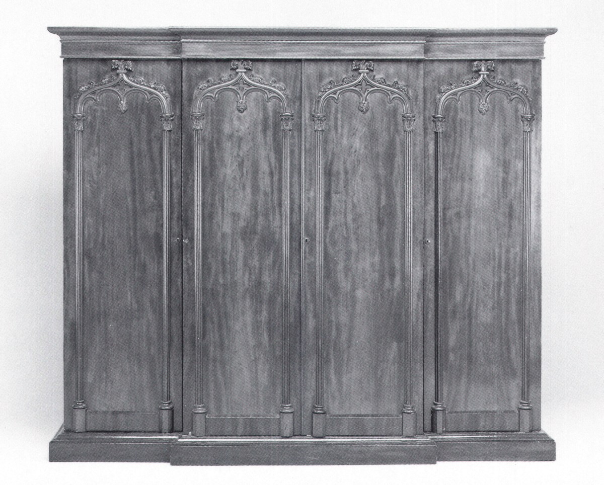 GARDE-ROBE de style gothique, en acajou, à ressaut. Elle ouvre par quatre portes ― ornées de colonnes fasciculées, d'arcades polylobées et feuillagées ― découvrant tiroirs et penderies. Corniche et plinthe à doucines.