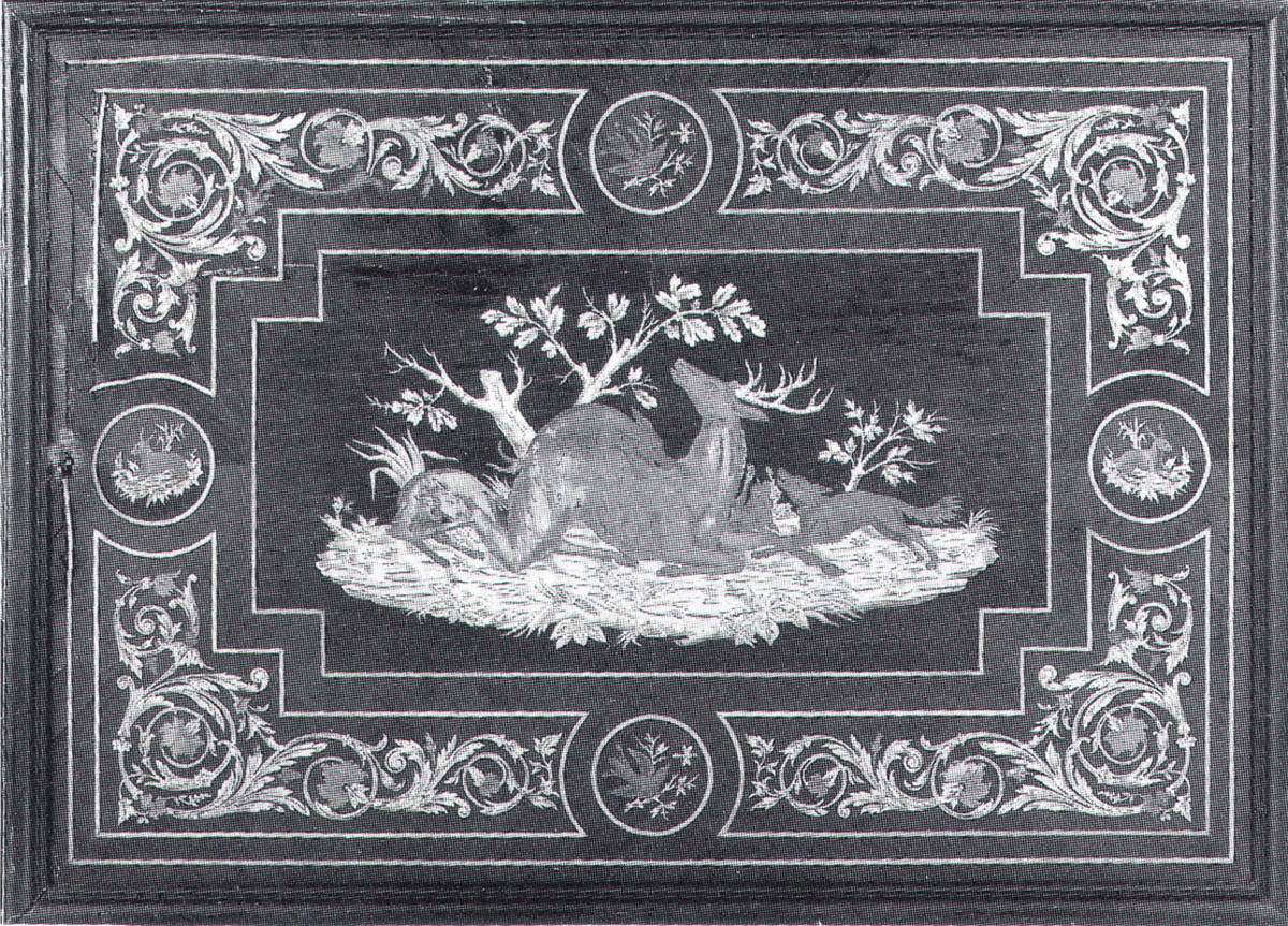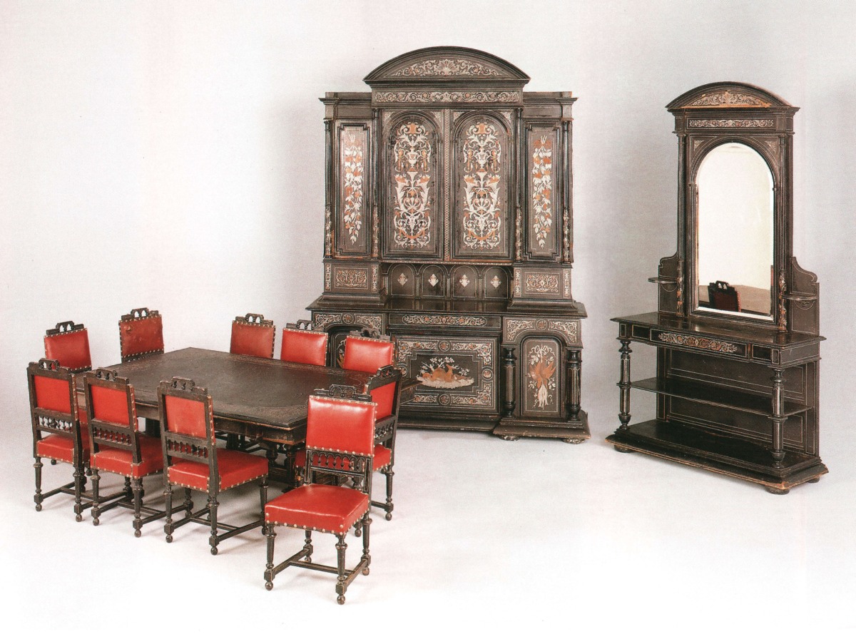 Importante SALLE A MANGER, en placage d'ébène et bois noirci. Riche décor en marqueterie d'étain et cuivre, dans la tradition de Boulle: rinceaux, acanthes, mascarons, urnes, cornes d'abondance, chutes de branches feuillagées et de fruits, nœuds, pampres. Représentations d'animaux sur le thème de la chasse et de la pêche: oiseaux, lièvres, perdrix, poissons, écureuils, cerf aux abois forcé par les chiens.