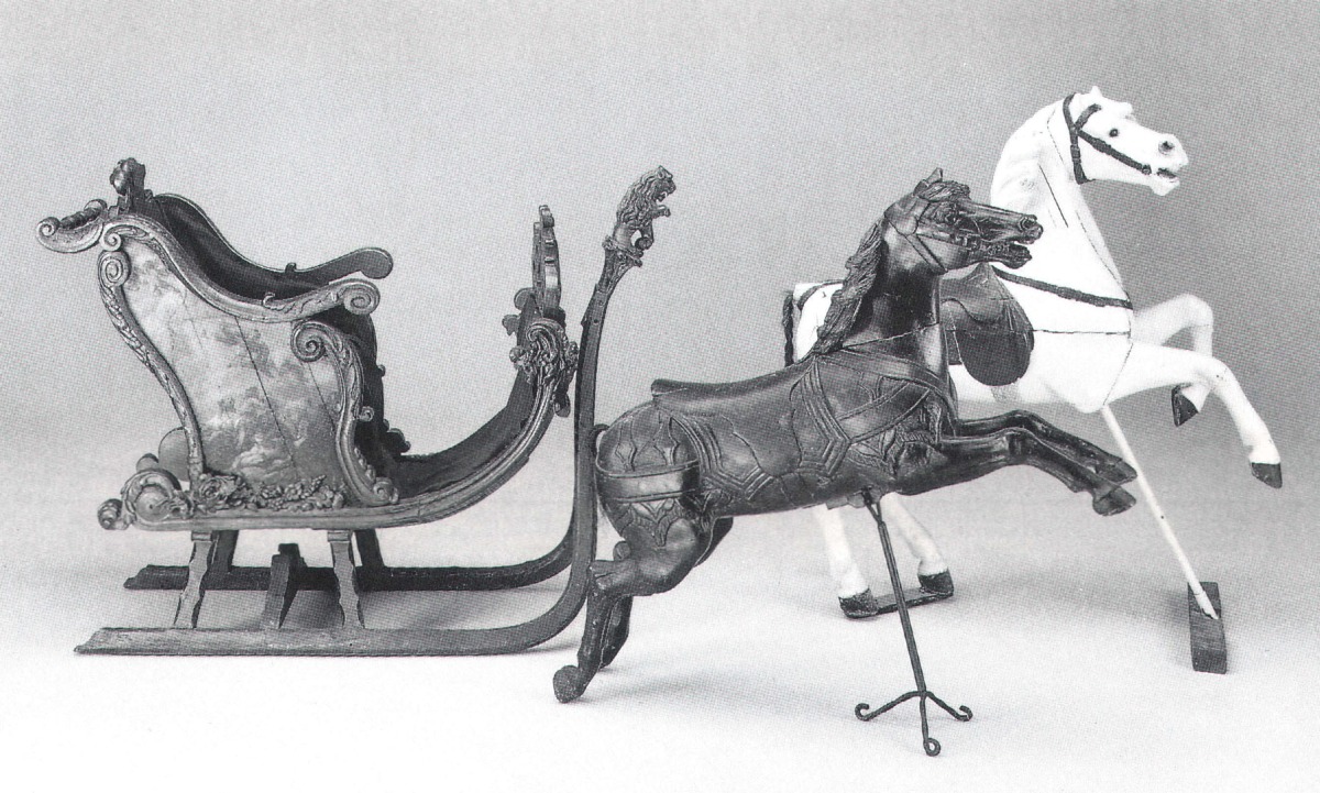 TRAÎNEAU en bois redoré mouluré et sculpté, à bergère posée sur patins. Riche ornementation de volutes, acanthes, guirlandes de fleurs et fruits, rosace, ruban noué, tresses, tores de laurier, gueule de lion. Flancs ornés de personnages allégoriques et dieux de l'Antiquité, dans les nuages, peints à l'huile sur toile.