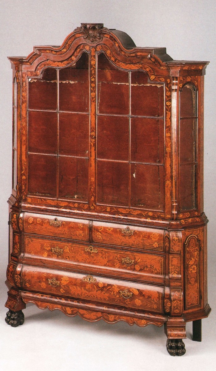 COMMODE-VITRINE, en placage d'acajou et marqueterie de bois clairs. Elle ouvre dans le bas par trois tiroirs et deux vantaux latéraux, et dans le haut par deux portes vitrées; les côtés sont vitrés. Fronton à corniche, tiroirs, montants et ceinture inférieure mouvementés. Riche marqueterie hollandaise polychrome de fleurs ― en guirlandes, chutes, ou en bouquets dans des vases feuillages, oiseaux, papillons. Pieds antérieurs griffes.