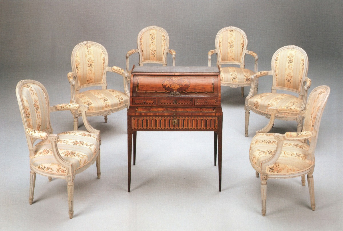 Suite de 6 FAUTEUILS cabriolet, en bois relaqué gris-bleu. Dossier cabriolet dit « à la montgolfière ». Sculpture de nœud, feuille de laurier, quatre feuilles, et cannelures des pieds à pointe d'asperge (une traverse refaite). Recouverts d'une fine soierie de bouquets fleuris. La silhouette du dossier paraît inspirée par le modèle de Louis Delanois, de 1769.