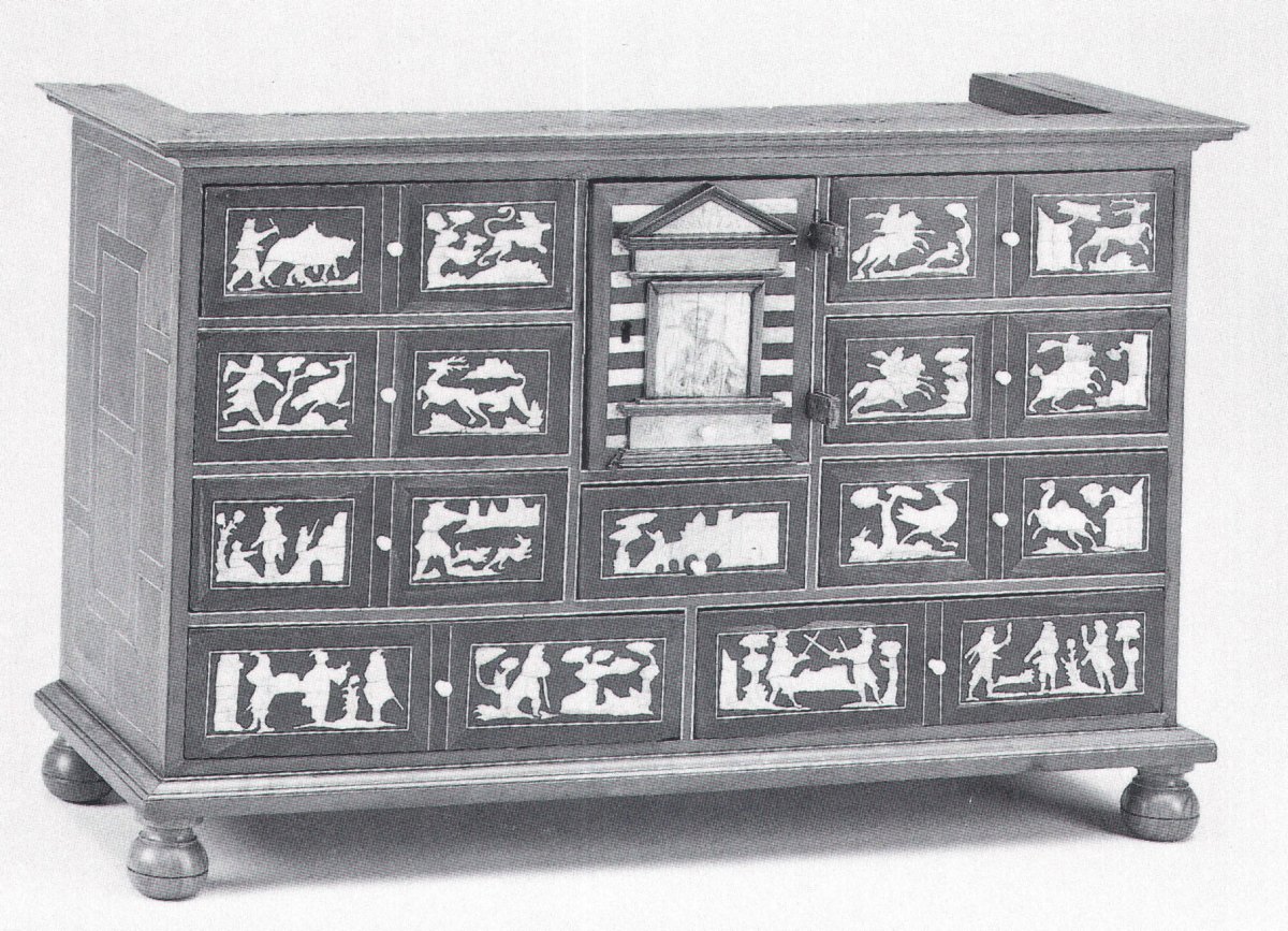 CABINET. Une porte au centre avec perspective intérieure entourée de tiroirs, les façades sont incrustées de sujets en ivoire, os: scènes de chasse, duels, animaux courants, vues de châteaux.