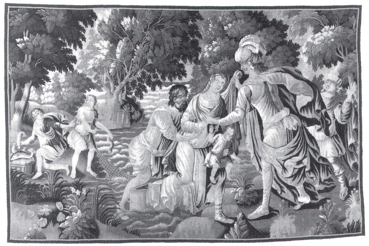 TAPISSERIE d'AUBUSSON du XVIIe siècle, verdure à sept personnages, représentant des gentilshommes aidant une jeune femme et son enfant à sortir d'une barque. Sur la gauche, deux pêcheurs tirent leur filet et déposent leurs poissons dans un panier.