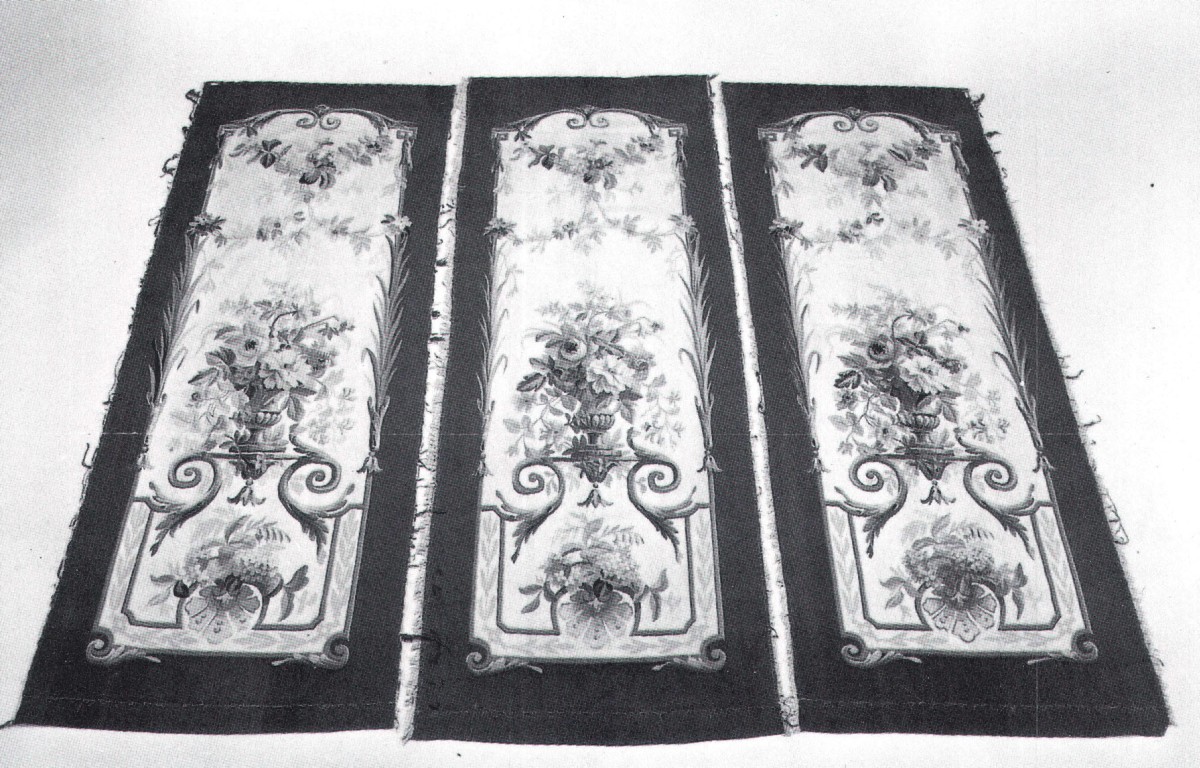 Suite de trois PORTIÈRES d'AUBUSSON d'entre-deux, fin XIXe en laine. Décor de fleurs, en bouquet, guirlande ou dans un vase, sur fond crème, dans un encadrement à volutes, grecques, acanthes, roseaux, coquille. Bordure rouge garance.