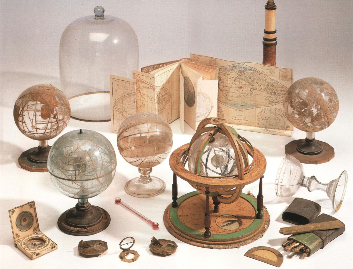 SPHÈRE UNIVERSELLE en verre. Un globe céleste gravé des constellations contenant un globe terrestre. Les deux globes sont séparés par une sphère armillaire bleue au mécanisme tournant en laiton. Monture et support en bois tourné, collage relatif aux calendriers, signes du zodiaque et graduations. Sur le plateau circulaire: carte de l'Europe et boussole. Piétement en acajou. Présentée sous cloche. Inscription imprimée: « La sphère universelle exécutée en verre par Ursin Barbay année 1817 ».