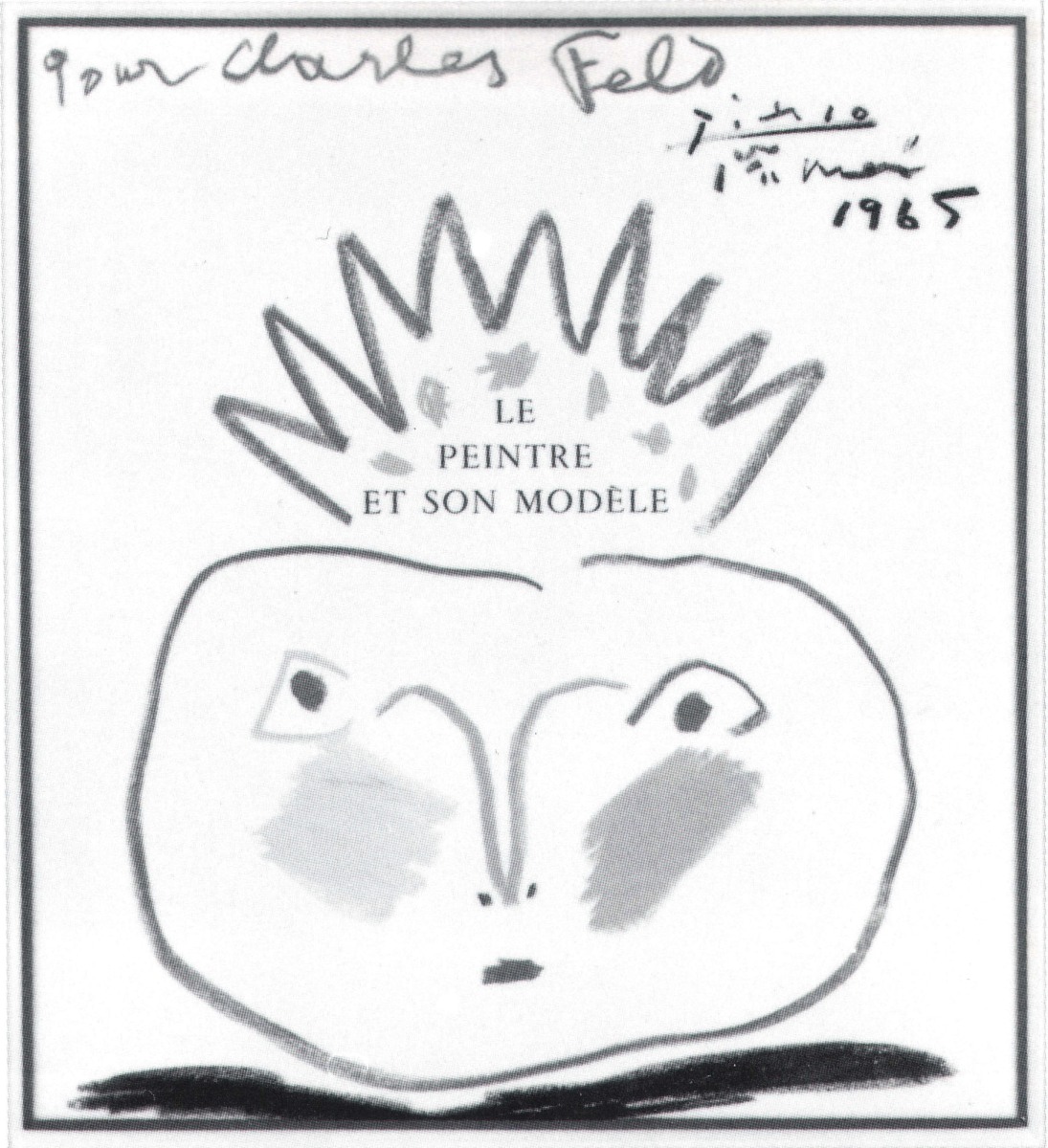 PICASSO. Tête d'homme. Pastel sur le faux titre du livre Le Peintre et son modèle. Signé et dédicacé en haut « Pour Charles Feld Picasso le 1er mai 1965 ».