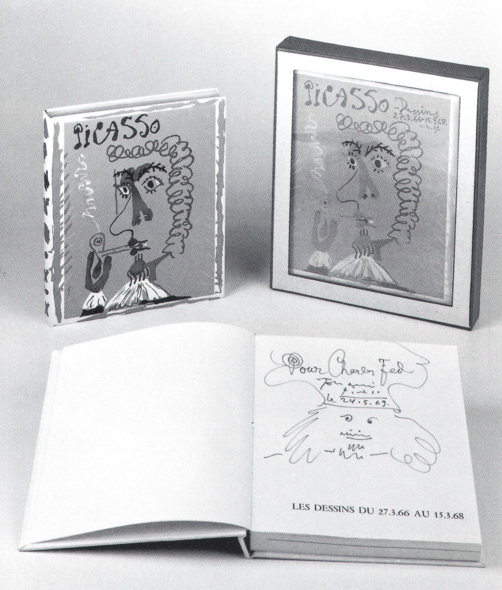 PICASSO. Dessins 27.3.66-15.3.68. Ed. Cercle d'Art, 1969. In-4° toile décorée. Un des 25 ex. HC réservés à l'Artiste. Avec une grande composition originale au feutre bleu, signée et dédicacée à Charles Feld. Sous coffret avec fenêtre en plexiglas. Sans la litho. originale.