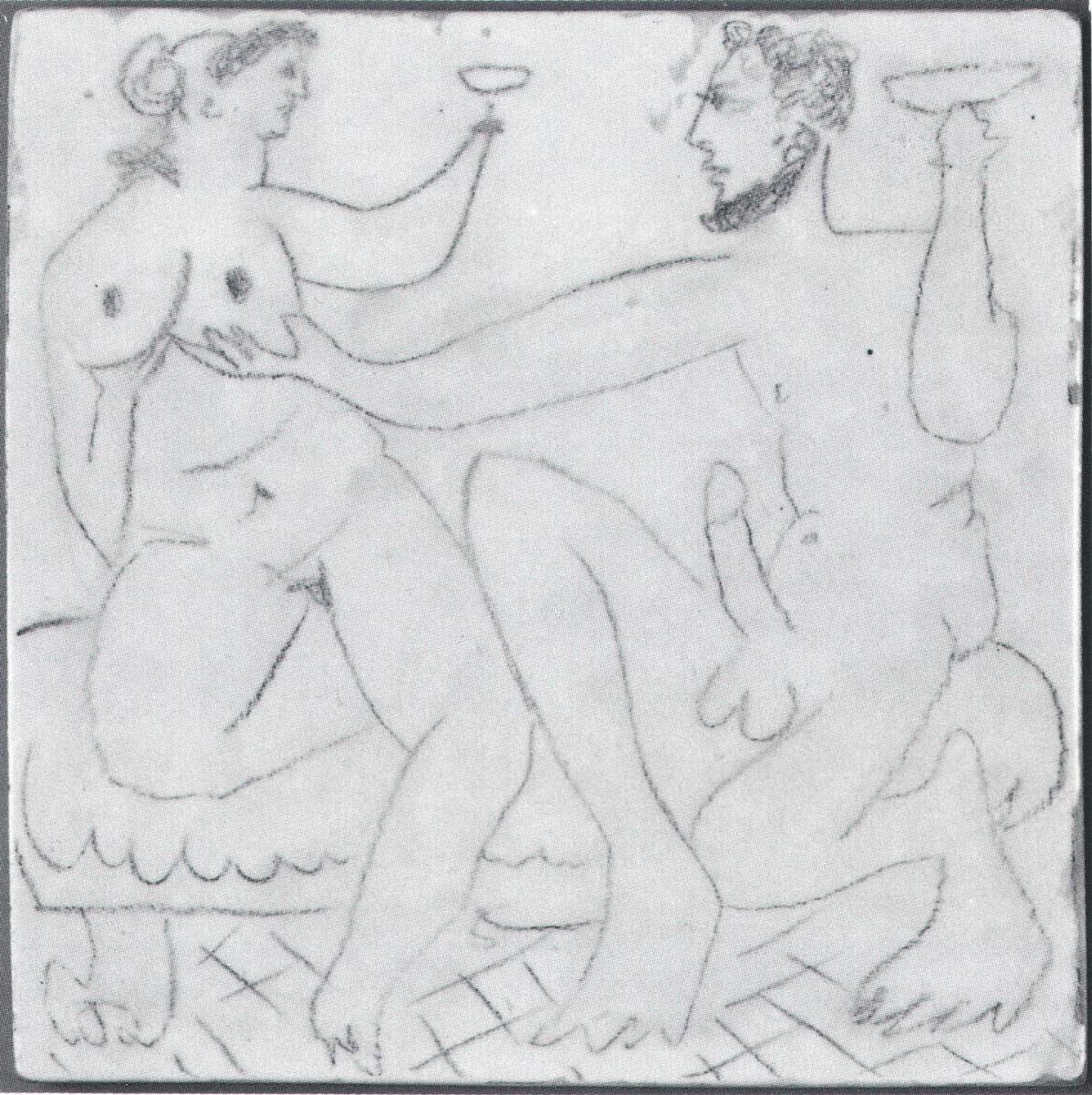 PICASSO. Dessin érotique. Carreau de faïence: dessin original vitrifié, daté...