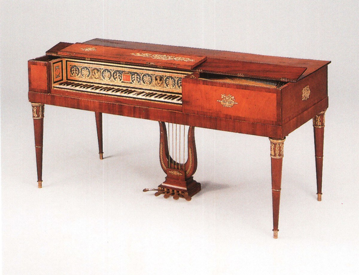 L'étendue du clavier est de 73 notes, six octaves du fa au fa. Les touches diatoniques sont en nacre, les touches chromatiques en ébène. La plaque de nom est recouverte de fixés sous verre églomisés bleu et rouge sur fond d'or, avec en médaillons: « Apollon à la lyre» et « Mercure au caducée », dans des réserves or sur fond noir.