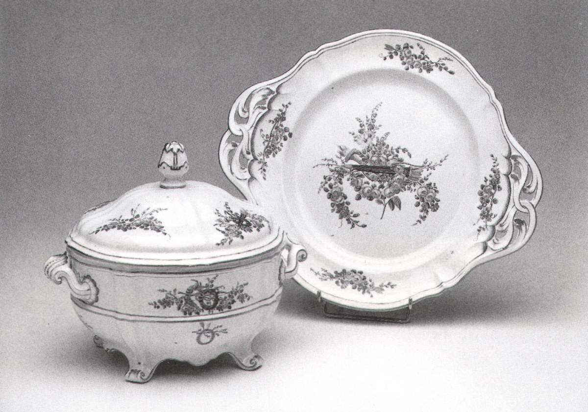 POT A OILLE et son dormant, en faïence fine. Anses de forme rocaille, pieds consoles et frétel en graine. Décor polychrome et or de filets, guirlandes et trophées militaires. (Restauration.)