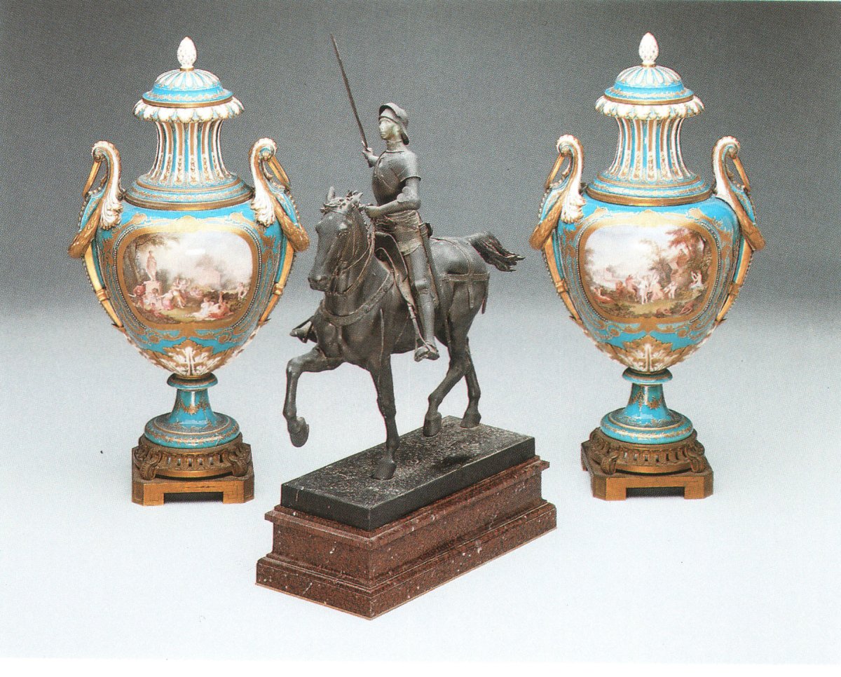 Paul DUBOIS (1827-1905). «Jeanne d'Arc équestre». Bronze à deux patines. Signature en terrasse du sculpteur et du fondeur « F. Barbedienne, fondeur », et cachet: « Réduction mécanique A. Collas ». Base en marbre rouge.