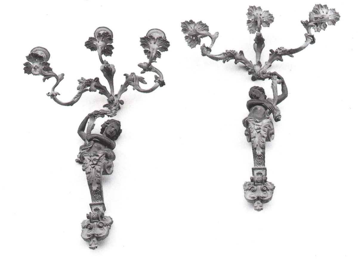 Paire d'APPLIQUES à termes, en bronze ciselé, patiné et doré. Les termes, qui tiennent une branche se scindant en trois bras de lumière, prolongent une console.