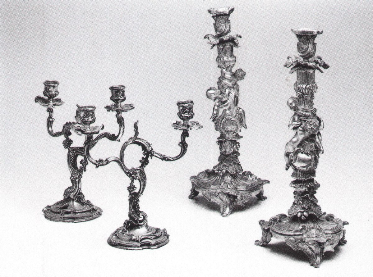 Une paire de flambeaux dans le même esprit, à sujet de faune et faunesse assis, ont été attribués à Caffieri, d'après un dessin de Meissonier.