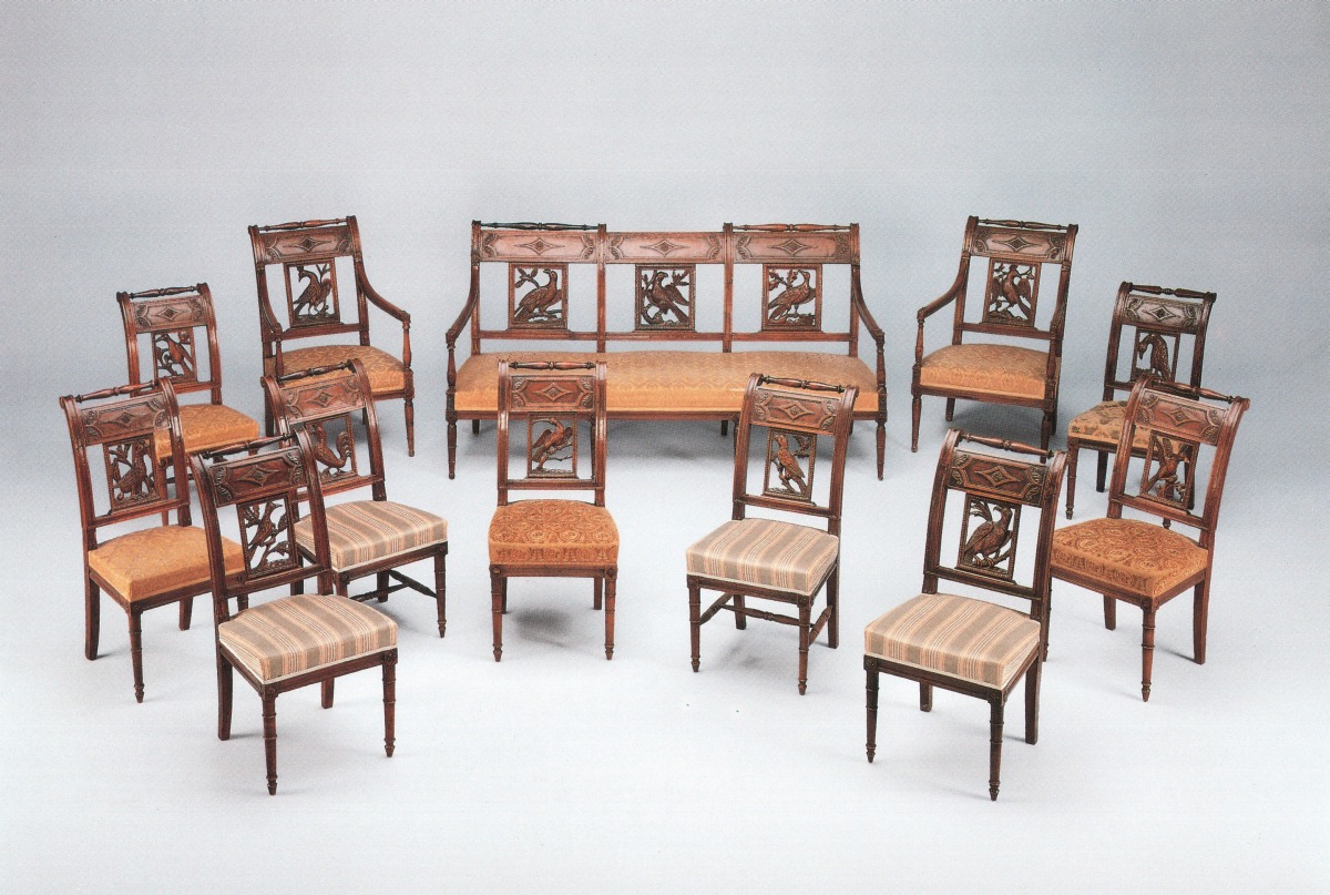 Décor de rosaces, feuilles stylisées, losanges et cannelures. Les dossiers, ajourés, sont tous ornés d'oiseaux exotiques différents, généralement figurés sur une branche: aigle, cacatoès ...