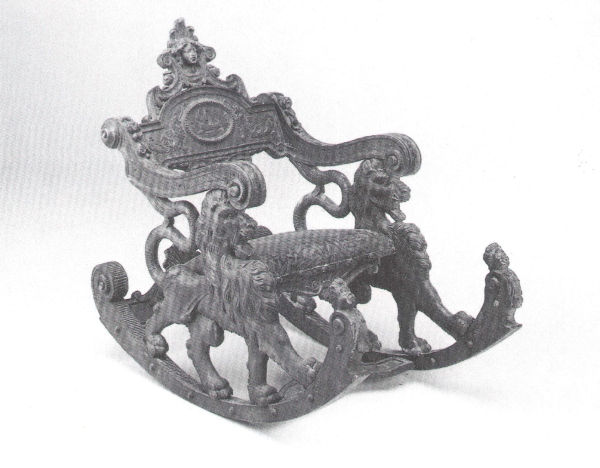 De tels fauteuils furent introduits aux États-Unis et en Grande-Bretagne dans les années 1760, mais ce sont les Américains qui contribuèrent le plus à la mode des rocking-chairs pendant le siècle suivant, ceux-ci arborant plus volontiers un style rustique. Notre fauteuil, s'il relève de cette mode, y conjugue celle pour les styles du passé, en s'inspirant de motifs Renaissance.