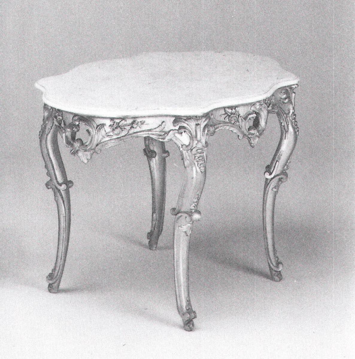 TABLE DE MILIEU violonée mouvementée et ajourée, en bois sculpté et doré, à décor de fleurettes, rocailles, volutes et palmettes. Elle repose sur quatre pieds galbés se terminant par des acanthes.