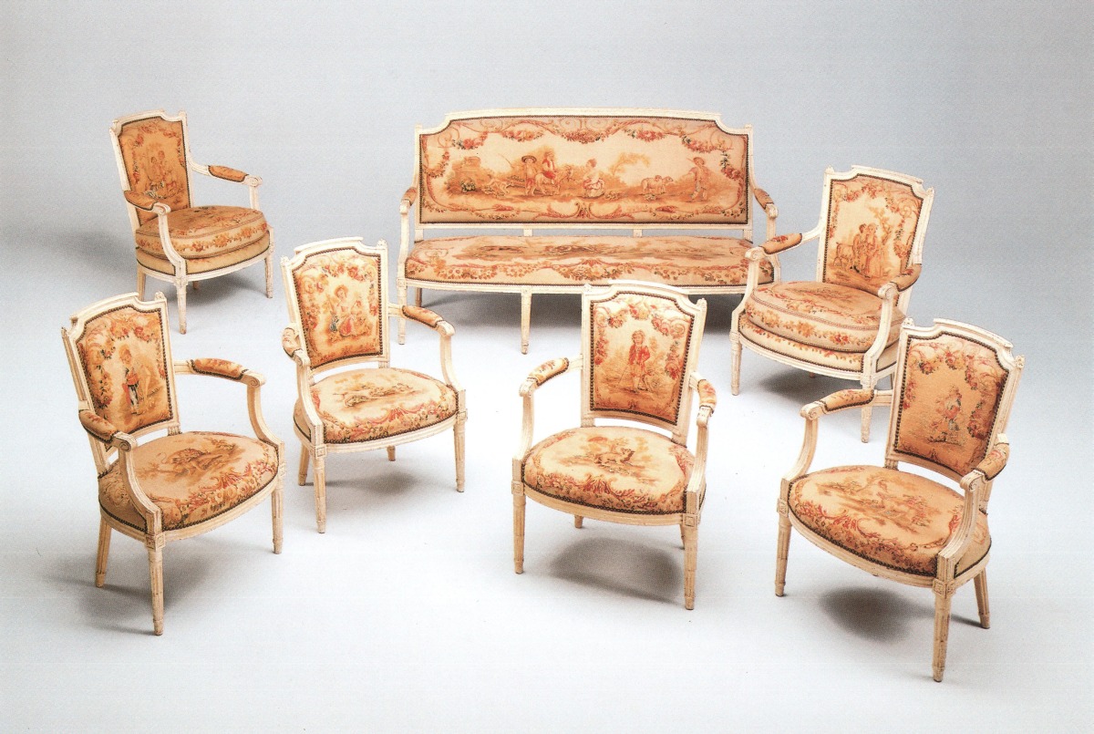 SALON LOUIS XVI, en bois relaqué crème, de sept pièces comprenant: un canapé trois places, une paire de grands fauteuils et deux paires de plus petits. Dossiers cabriolet à chapeaux de gendarme cernés de graines éclatées. Ceinture bombée, dés de raccordement à quatre-feuilles. Piètement à cannelures à pointes d'asperge. Fine tapisserie d'Aubusson (restauration) polychrome à rehauts rouges, à décor d'enfants jardiniers (d'après J.-B. Huet) et des Fables de La Fontaine (d'après J.-B. Oudry).