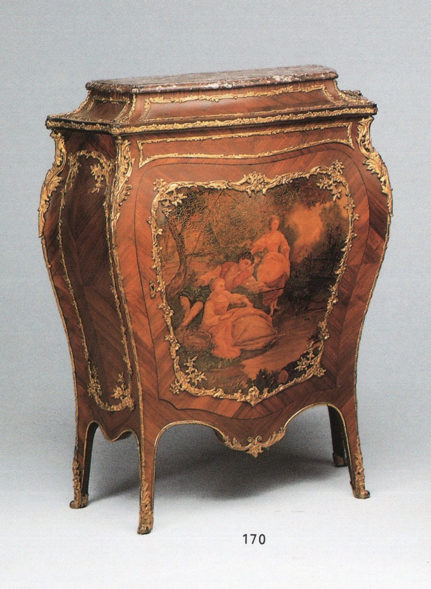 MEUBLE D'APPUI, en placage de bois de violette. De forme galbée sur trois faces, il repose sur des pieds cambrés. Il ouvre à un vantail peint en polychromie d'une scène pastorale galante de pêche, dans le goût de Lancret. Riche ornementation de bronzes dorés et ciselés: chutes, encadrements, astragales, ceinture, agrafes, sabots -à motifs de fleurettes, coquilles, volutes, rocailles.